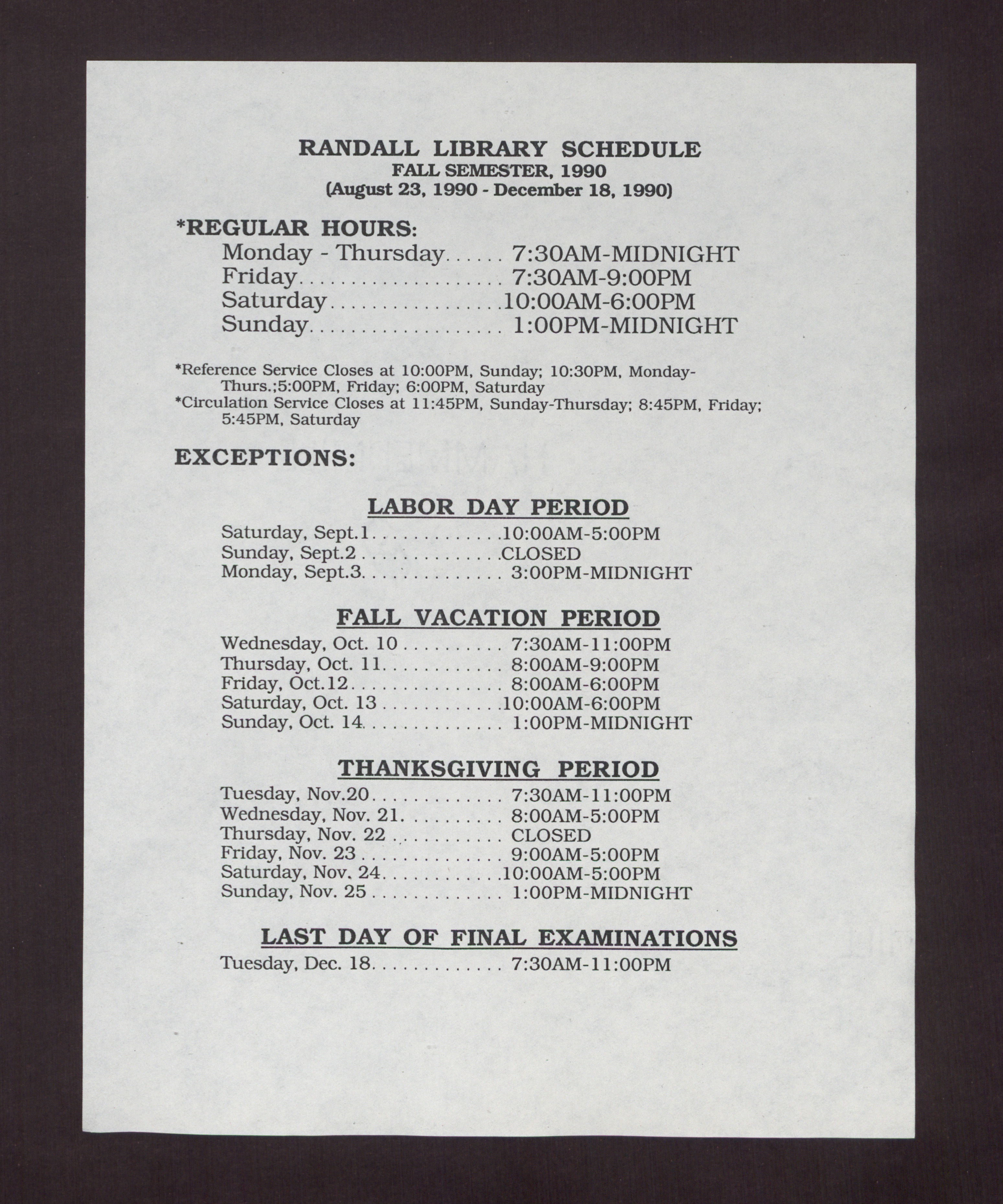 - Fall semester hours including holidays and fall break