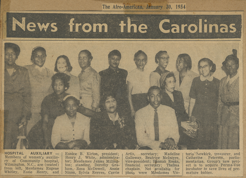 - News article featuring members of women's auxiliary of Community hospital, Wilmington, N.C.