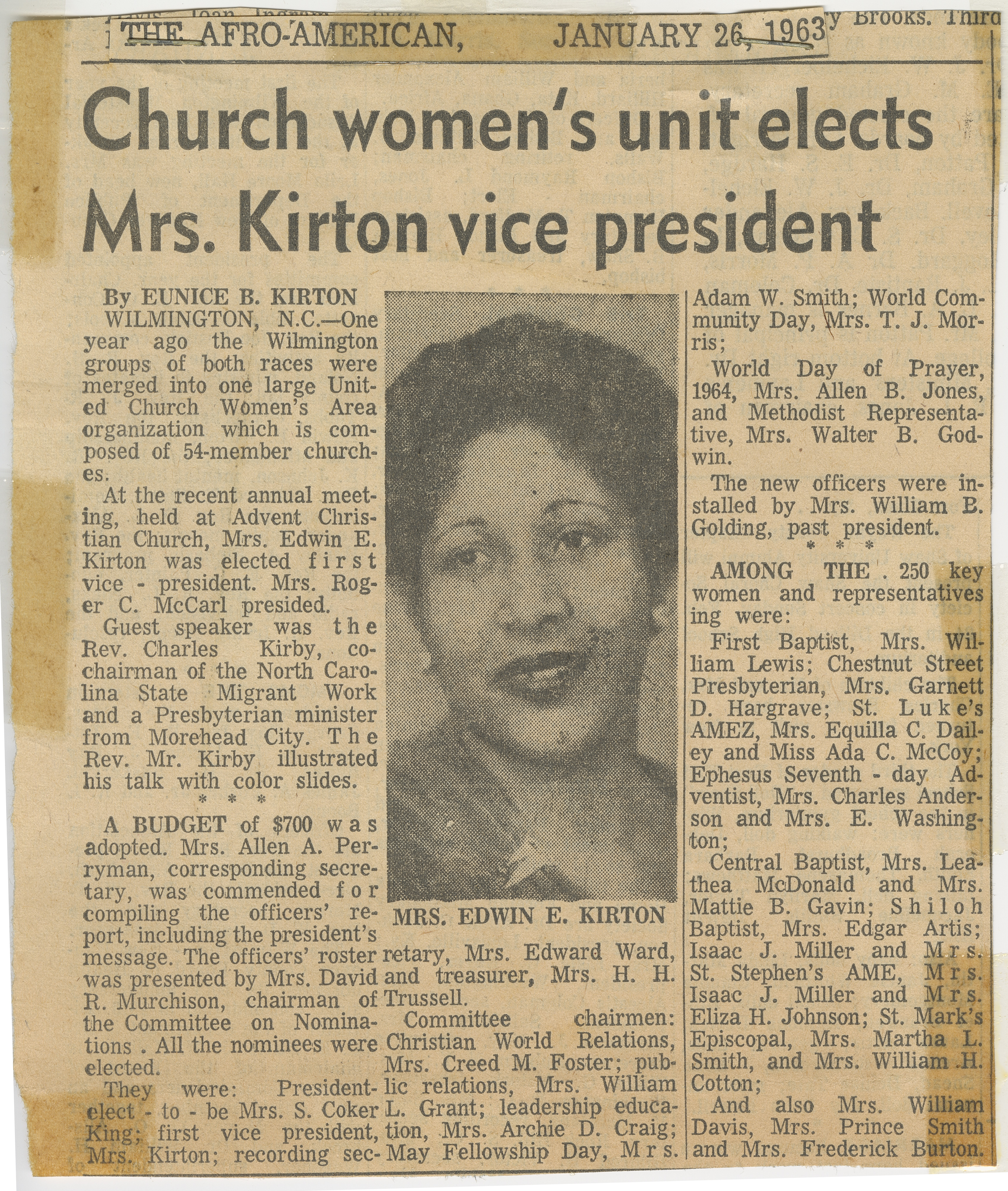 - Church women's unit elects Mrs. Kirton vice president, The Afro-American, 1963 January 26